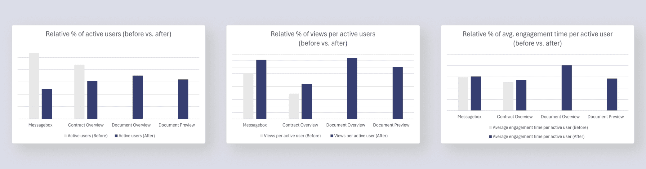 Adoption and funnel shift: The new document overview and review became the main touchpoint within the first month. Usage of the inbox dropped by 32 %, while the new features accounted for over half of all document interactions.